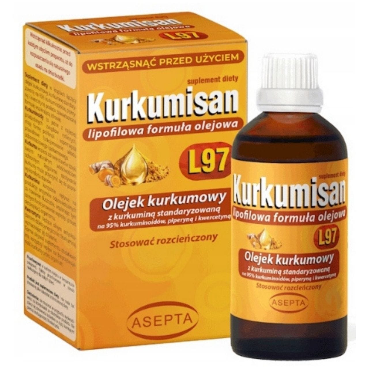 O óleo de curcuma Asepta Kurkumisan é um suplemento alimentar na forma de gotas . Contém óleo de rizomas de curcuma Curcuma longa ( ) , extrato de curcuma padronizado a 95% curcuminoides , extrato de pimenta preta padronizado a 95% piperina , quercetina e manganês em azeite extra virgem. A fórmula é enriquecida com óleo de rosa mosqueta. Dose diária: 5 gotas 2-3 vezes ao dia . Não contém: glúten , lactose , OGMs , corantes artificiais.