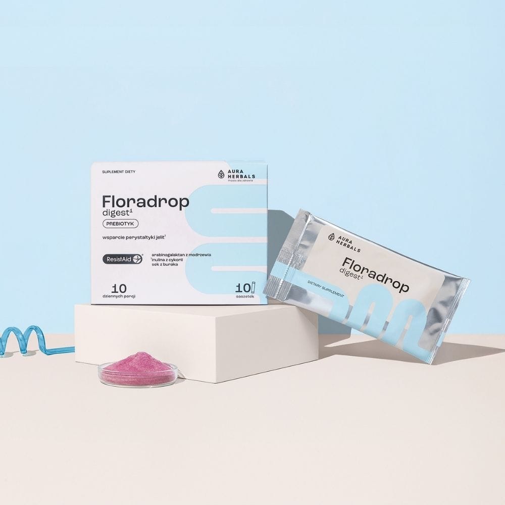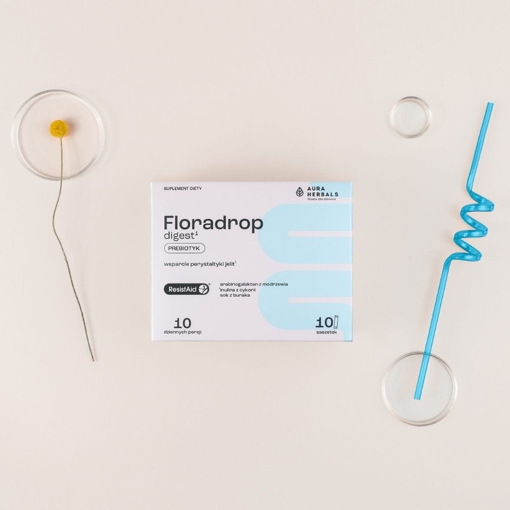 Aura Herbals Floradrop digest é um suplemento alimentar em pó em saquetas práticas. Uma fonte natural de prebióticos . Contém extrato de larício americano (Larix laricina) padronizado para 85% de arabinogalactano (ResistAid ®). Com adição de inulina de chicória e sumo de beterraba.