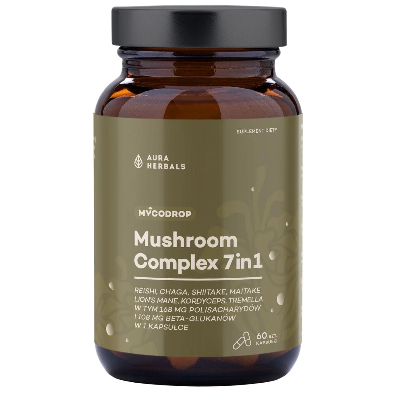 Aura Herbals O Complexo de Cogumelos 7-em-1 é um suplemento alimentar em cápsulas de celulose vegan contendo 7 extratos padronizados dos corpos frutíferos de cogumelos funcionais (DER 30:1): reishi, chaga, shiitake, maitake, lion’s mane, cordyceps chinês e tremella. 1 cápsula fornece um total de 560 mg de extratos, incluindo 168 mg de polissacarídeos e 108 mg de beta-glucanos. O produto é vegan e isento de aditivos desnecessários. Não contém: glúten, lactose, gelatina, corantes ou conservantes.