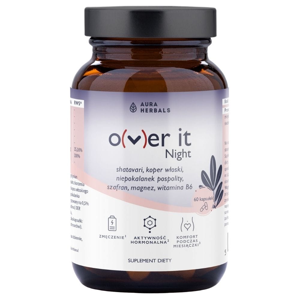 Aura Herbals Over It Night é um suplemento alimentar em cápsulas. Fonte de extratos vegetais de árvore castanha, açafrão, shatavari, e erva-doce. A composição é enriquecida com magnésio e vitamina B6 (Quali ® -B).