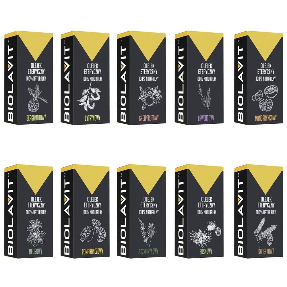 Conjunto de 10 óleos essenciais da Bilovit. O conjunto inclui óleos de bergamota, limão, toranja, lavanda, tangerina, erva-cidreira, laranja, alecrim, abeto, e pinheiro.