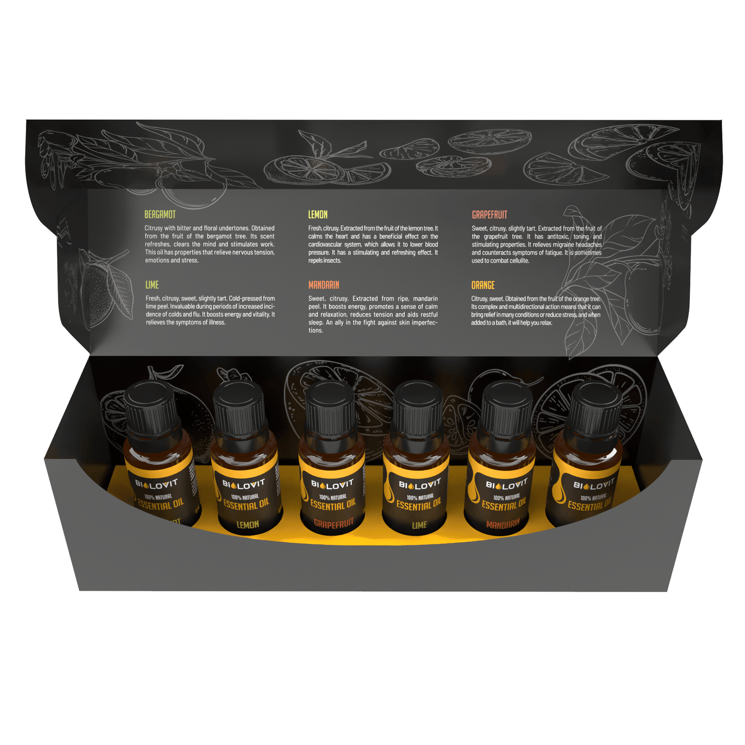 O conjunto de óleos «Power of Citrus» foi criado para pessoas que desejam envolver-se no aroma cítrico dos óleos essenciais naturais. O conjunto inclui os óleos essenciais cítricos mais populares que todos os verdadeiros amantes de cítricos devem conhecer. A elegante caixa preta e amarela contém até seis óleos essenciais 100% naturais da Bilovit. O conjunto foi cuidadosamente concebido para que esteja pronto a oferecer como presente , e para que os óleos incluídos não se movam durante o transporte.