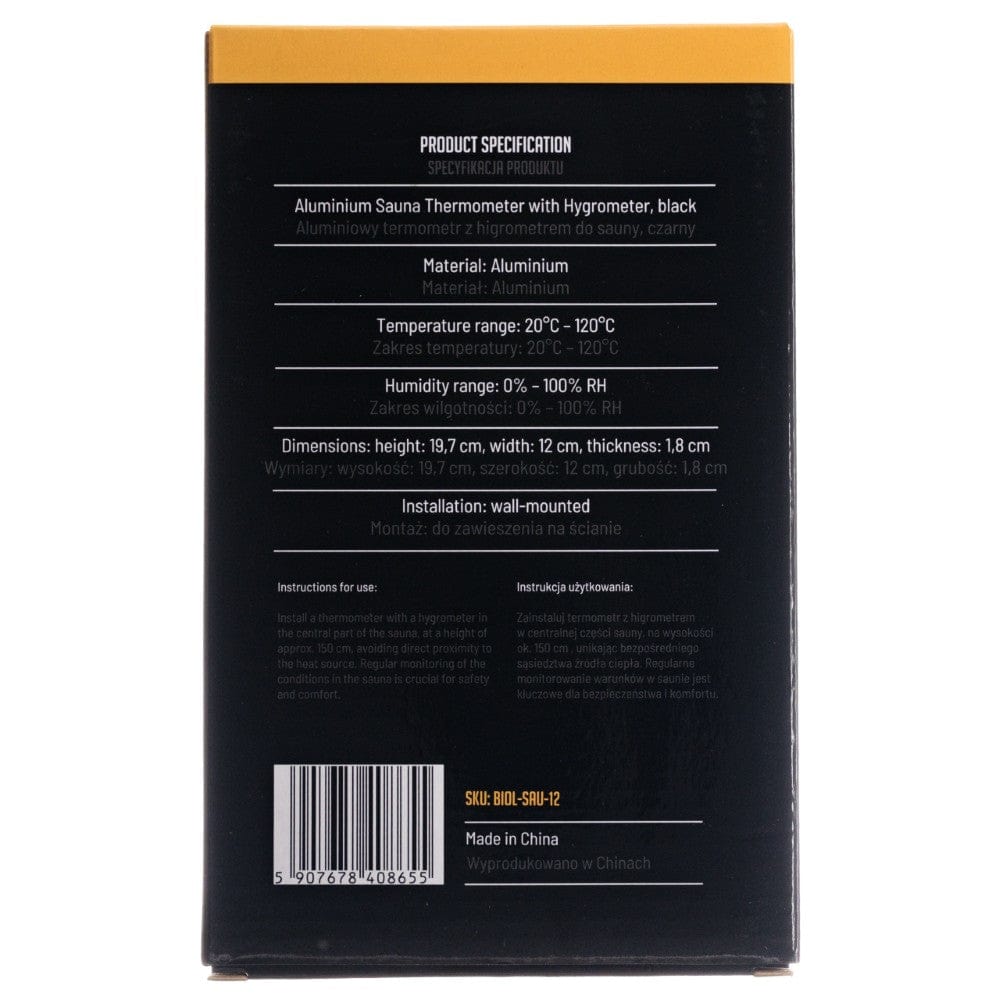 A marca Bilovit é sinónimo de qualidade e durabilidade. O termómetro e o higrómetro são fabricados de forma sólida e, graças à caixa de alumínio, resistente às condições adversas da sauna. O seu design elegante em preto e a sua medição precisa fazem dele não só um instrumento funcional, mas também um complemento elegante para qualquer sauna.