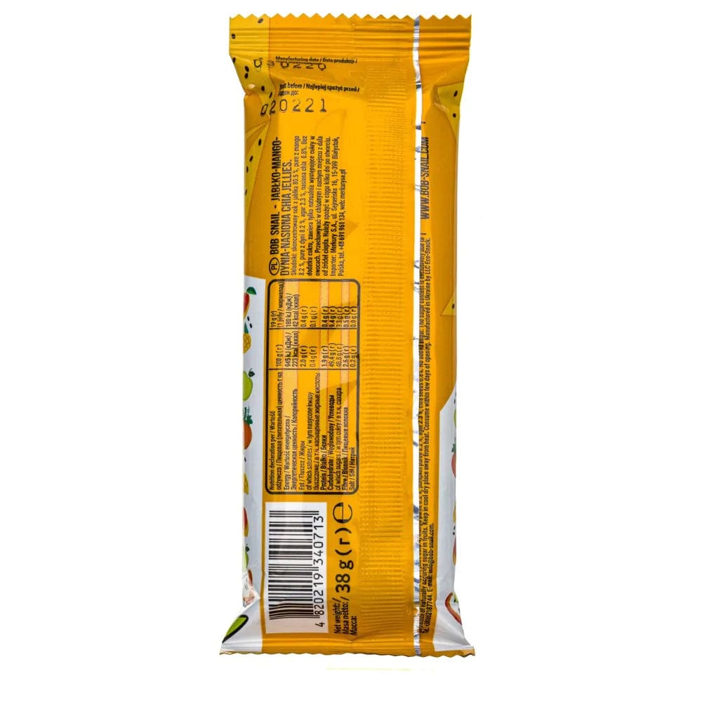 Bob Snail Geleias maçã-manga-abóbora são snacks de fruta naturais do fabricante Eco-Snack. Não encontrará conservantes ou corantes nos produtos Bob Snail. As gelatinas Bob Snail são adequadas para vegans e não contêm gelatina .