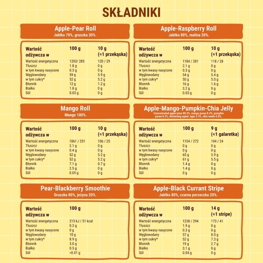 - Gelatina de maçã, manga, abóbora e chia (ingredientes: 80,5% de sumo de maçã concentrado,8,2% de puré de manga,8,2% de puré de abóbora, espessante: 2,3% de ágar,0,8% de sementes de chia).