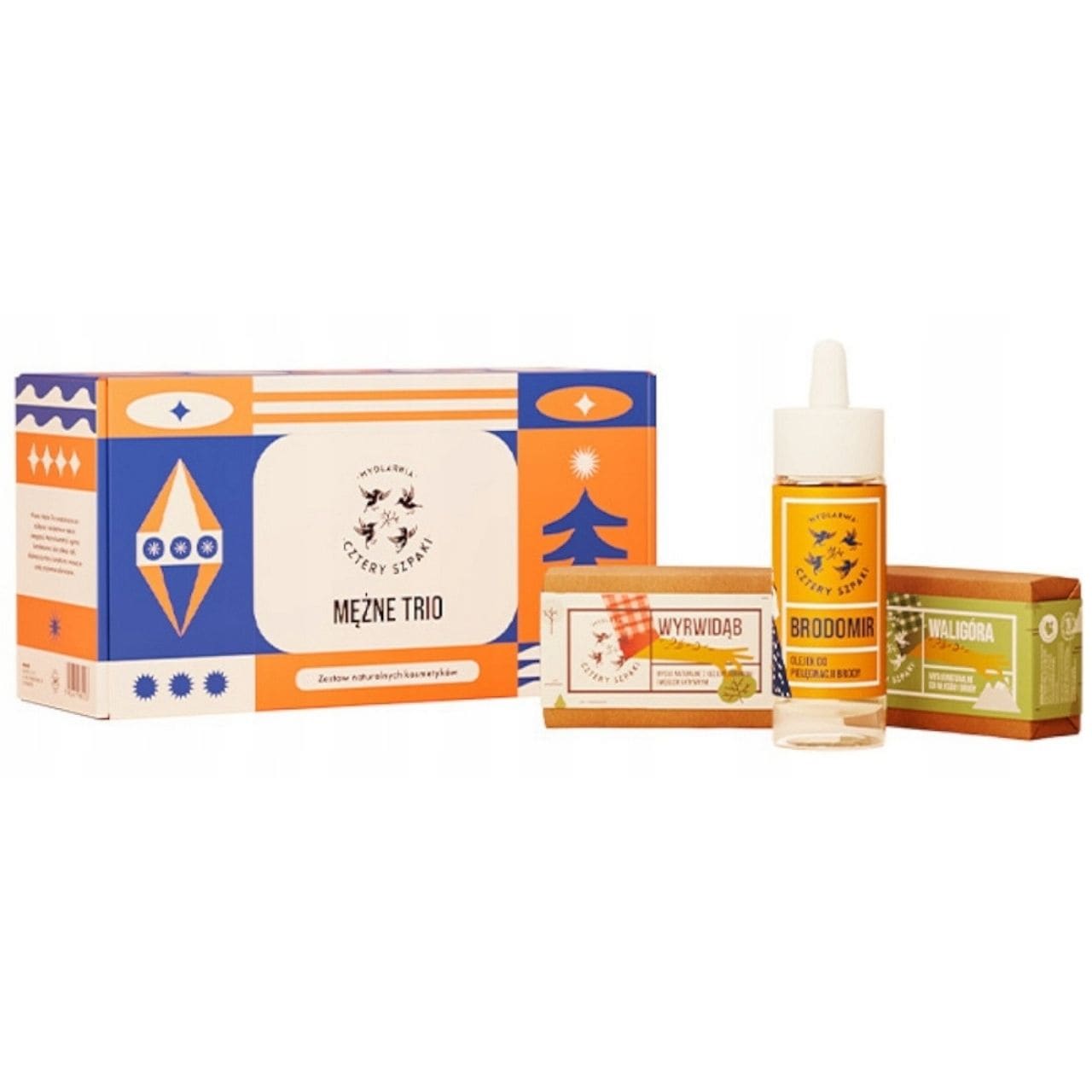 A caixa festiva contém óleo para barba Brodomir , sabonete para barba Waligóra e sabonete corporal de dupla camada Wyrwidąb com carvão ativado . O presente perfeito para homens que apreciam produtos de cuidados da pele simples e eficazes com aromas masculinos.