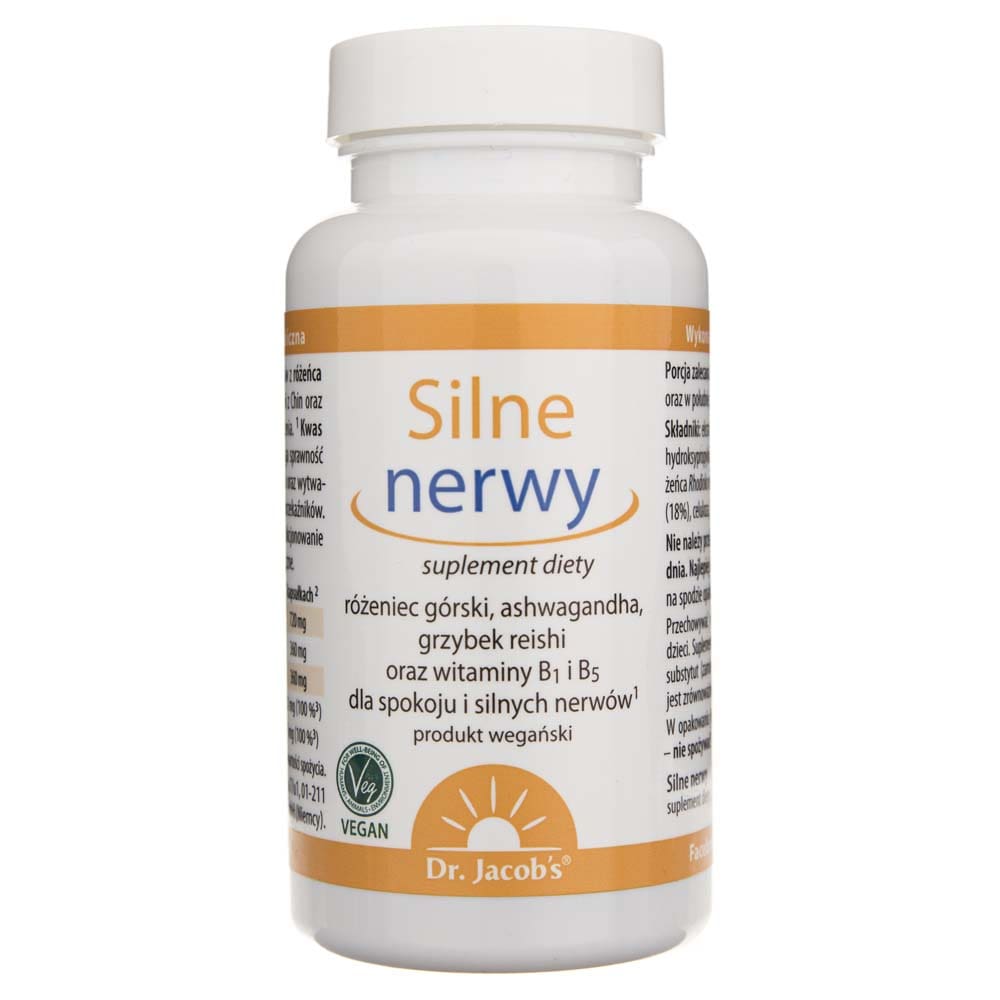 nervos fortes de Dr. Jacob's é um suplemento dietético sob a forma de cápsulas de celulose contendo: rhodiola rosea , ashwagandha , reishi cogumelo e vitaminas B1 e B5 para nervos calmos e fortes.
