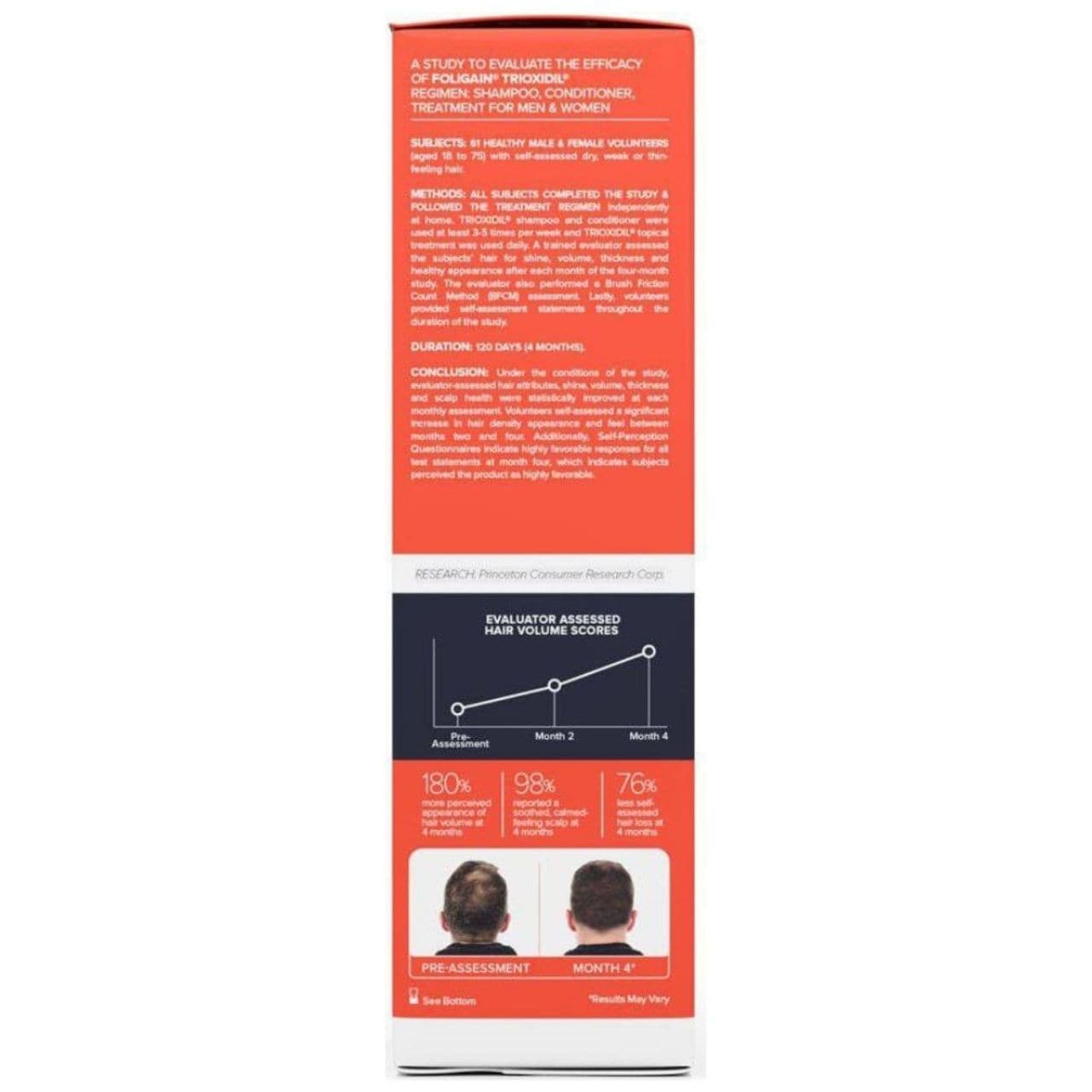 O champô FOLIGAIN representa os mais recentes avanços na luta contra a alopecia androgenética . O ingrediente principal é o complexo patenteado Trioxidil ® numa concentração de 2%, cuja eficácia foi confirmada em rigorosos ensaios clínicos. Os resultados são impressionantes: Aumento de 180% no volume do cabelo após 4 meses, Redução de 76% na queda de cabelo durante o mesmo período, e Melhoria de 75% na densidade após apenas 2 meses de uso.