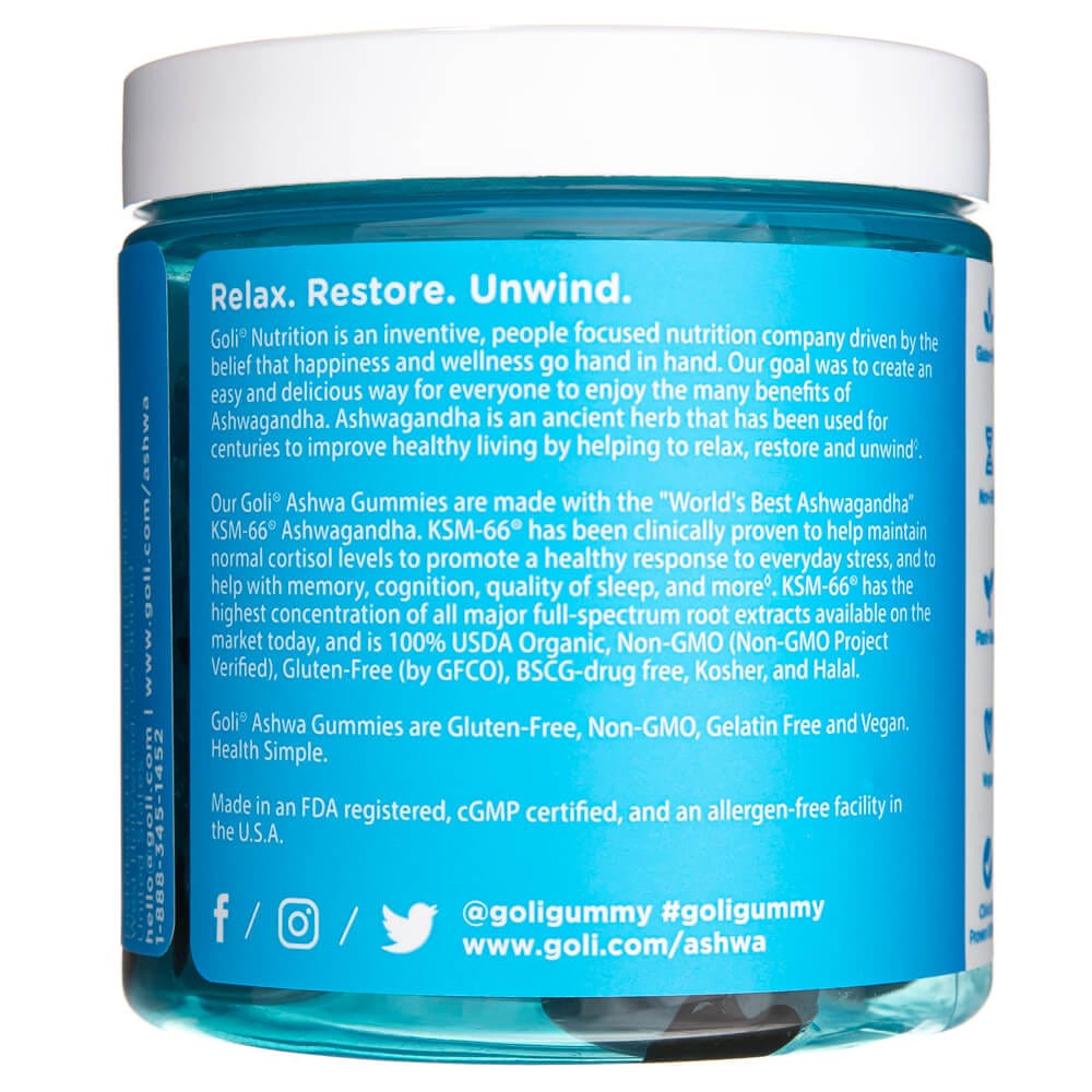 Ashwagandha da Goli Nutrition é um suplemento alimentar em gomas com sabor a frutos silvestres que contém extrato de raiz de Ashwagandha KSM-66 ®. A fórmula também é enriquecida com vitamina D2.