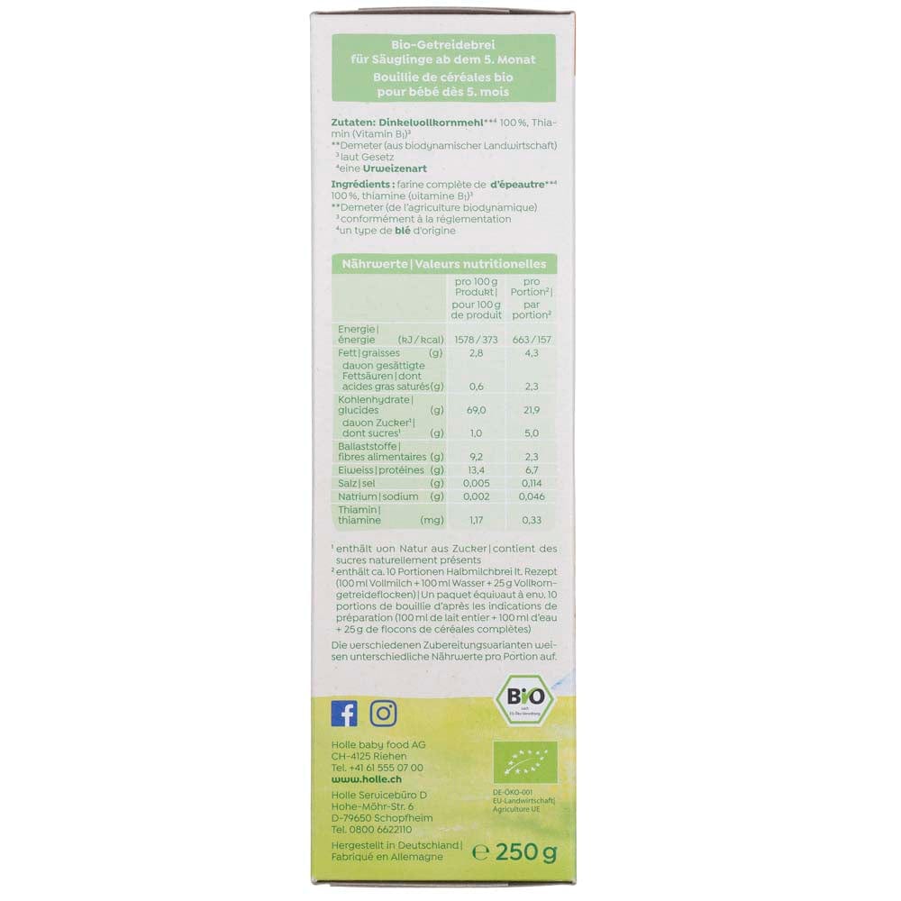 Holle BIO Espelta de grão inteiro A papa de grão inteiro é sem adição de açúcar, mas contém açúcares naturais, tornando-a ideal para crianças que necessitam de uma dieta especial ou são sensíveis a certos ingredientes. Esta papa é também facilmente digerível e facilmente absorvida pelo corpo das crianças.