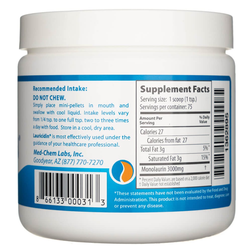 Lauricidin da Med-Chem Labs é um suplemento dietético contendo monolaurina pura (C-12 sn1 monoglicérido) derivado do óleo de coco. A mesma monolaurina é obtida do leite materno, Saw Palmetto e Melão Amargo. Lauricidin ® é um concentrado de ácido láurico ((3) -monolaurina) na forma de mini grânulos (~30mg um grânulo) .