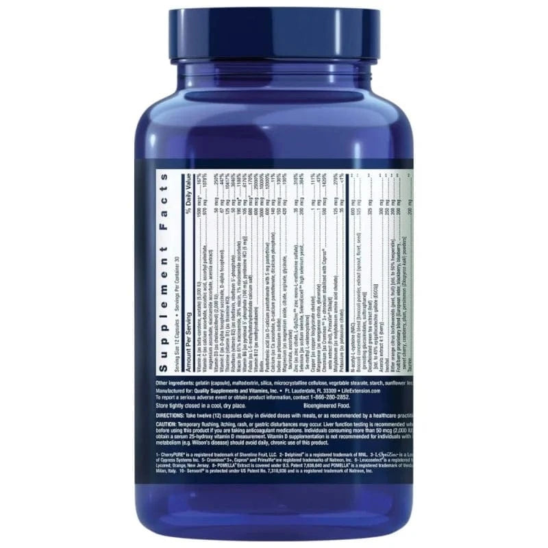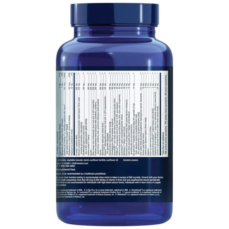 Vitamina A (como beta-caroteno, acetato) (5000 UI), Vitamina C (como ascorbato de cálcio, ácido ascórbico, palmitato de ascorbilo, ascorbato de magnésio, ascorbato de niacinamida, extrato de acerola), Vitamina D3 (como colecalciferol) (2000 UI), Vitamina E (como succinato de D-alfa tocoferilo, D-alfa tocoferol), Tiamina (vitamina B1) (como cloridrato de tiamina), Riboflavina (vitamina B2) (como riboflavina, Riboflavina 5'-fosfato), Vitamina B6 [como piridoxal 5'-fosfato (100 mg), piridoxina HCI (5 mg) ], Folato (como sal de cálcio de L-5-metiltetrahidrofolato), Vitamina B12 (como metilcobalamina), Biotina, Ácido pantoténico (como D-pantotenato de cálcio com 5 mg de pantetina), Cálcio (como ascorbato de cálcio, D-pantotenato de cálcio, fosfato dicálcico), Iodo (como iodeto de potássio), Magnésio (como óxido de magnésio, citrato, arginato, glicinato, taurato, ascorbato), Zinco (como citrato de zinco, L-OptiZinc ® 3 sulfato de zinco mono-L-metionina), Selénio [como selenito de sódio, SelenoExcell ® 4 levedura com elevado teor de selénio, Se-metil-L-selenocisteína], Cobre [como quelato de cobre bisglicinato], Manganês (como citrato de manganês, gluconato de manganês), Crómio [como Crominex ® crómio 5 3+ estabilizado com Capros ® extrato de amla (fruto), PrimaVie ® Shilajit], Molibdénio (como quelato de molibdénio de aminoácidos), Potássio (como citrato de potássio), Mistura concentrada de brócolos [brócolos pó, extrato (rebentos, inflorescências, sementes) (fornecendo glucosinolatos, sulforafano) ], N-acetil-L-cisteína (NAC), Extrato de chá verde descafeinado (folha) [std. até 45% de galato de epigalocatequina (EGCG) ], Extrato de acerola 4:1 (bagas), Inositol, Bioflavonóides de citrinos da laranja amarga (casca, fruto) [std. até 50% de hesperidina], Mistura patenteada de frutos e bagas [sabugueiro, amora preta, mirtilo, cereja, arando, ameixa, dióspiro (Diospyros kaki) pó], Taurina, Extrato de antocianina de mirtilo selvagem (fruto), Sensoril ® 10 Extrato de Ashwagandha (raiz, folha) [std. até 32% de oligossacáridos,10% de conjugados glicosídicos], Silimarina [do extrato de cardo mariano (semente) ], Trimetilglicina (TMG) (como betaína anidra), CherryPure ® 1 extrato de proantocianidina (casca), POMELLA ® 8 Extrato de romã (fruto) [std. até 30% de punicalaginas], Tocoferóis mistos naturais (fornecendo gama, delta, alfa, beta tocoferóis), MirtoSelect ® 9 Extrato de mirtilo (fruto), Leucoselect ® 6 Extrato de proantocianidina de semente de uva, Bio-Quercetina ® Mistura patenteada que fornece 35% de quercetina (5 mg) [de sophora japonesa concentrada (botão de flor) ],30% de galactomananos (4 mg) [de sementes de feno-grego () ] 15 mg, Bromelaína [de caule de ananás () ] (2400 unidades digestivas de gelatina/grama), Luteína [de extrato de calêndula (flor) ] (fornecendo 465 mcg de trans-zeaxantina), Extrato de azeitona (fruto) (fornecendo polifenóis, hidroxitirosol, tirosol, oleuropeína), Extrato de lignana de sementes de sésamo, Luteolina [de botões de flores de sofora japonesa () ], Apigenina, Boro (como quelato de aminoácido de boro), Licopeno [de LycoBeads ® 7 extrato natural de tomate (fruto) ], Delfinidina [de Delphinol ® 2 extrato de bagas de maqui (Aristotelia chilensis) (fruto) ], Cianidina 3-glucósido (C3G) [de extrato de groselha preta (fruto) ], Gelatina (cápsula), Agentes de enchimento: maltodextrina, sílica, celulose microcristalina, estearato vegetal, amido, lecitina de girassol, óleo de girassol.