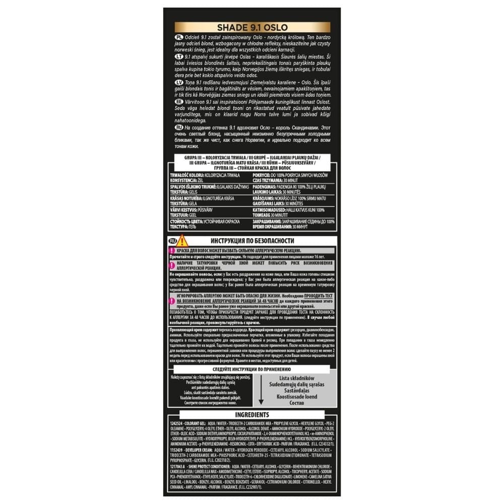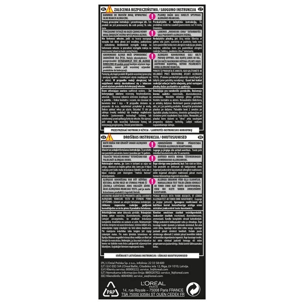 L'Oréal Paris Preference proporciona uma cor intensa e brilhante que dura até 8 semanas. A nova fórmula garante uma melhor cobertura das fibras capilares, proporcionando um efeito luminoso e duradouro num tempo de aplicação mais curto. Como utilizar: Siga as instruções de utilização incluídas na embalagem. Antes de usar, certifique-se de realizar um teste de alergia 48 horas antes da aplicação, mesmo que já tenha usado produtos de coloração anteriormente. INCI: Gel colorante: Aqua/Água, Trideceth-2 Carboxamide Mea, Propilenoglicol, Hexilenglicol, PEG-2 Oleamina, Poligliceril-4 Oleil Éter, Álcool Oleílico, Álcool Denat., Hidróxido de amónio, Poligliceril-2 Oleil Éter, Ácido oleico, Dietilaminopropil Cocoaspartamida de sódio,2,4-Diamino-Fenoxietanol HCl, m-Aminofenol, Metabissulfito de sódio, Hidroxipropil Bis (n-Hidroxietil-p-fenilenodiamina) HCL, Hidroxibenzo morfolina, Eugenol, Acetato de amónio, Linalol, Alfa-isometil ionona, p-Fenilenodiamina, Resorcinol, EDTA, Citronelol, Ácido eritórbico, Perfume/Fragrância, (FIL C201760/1).