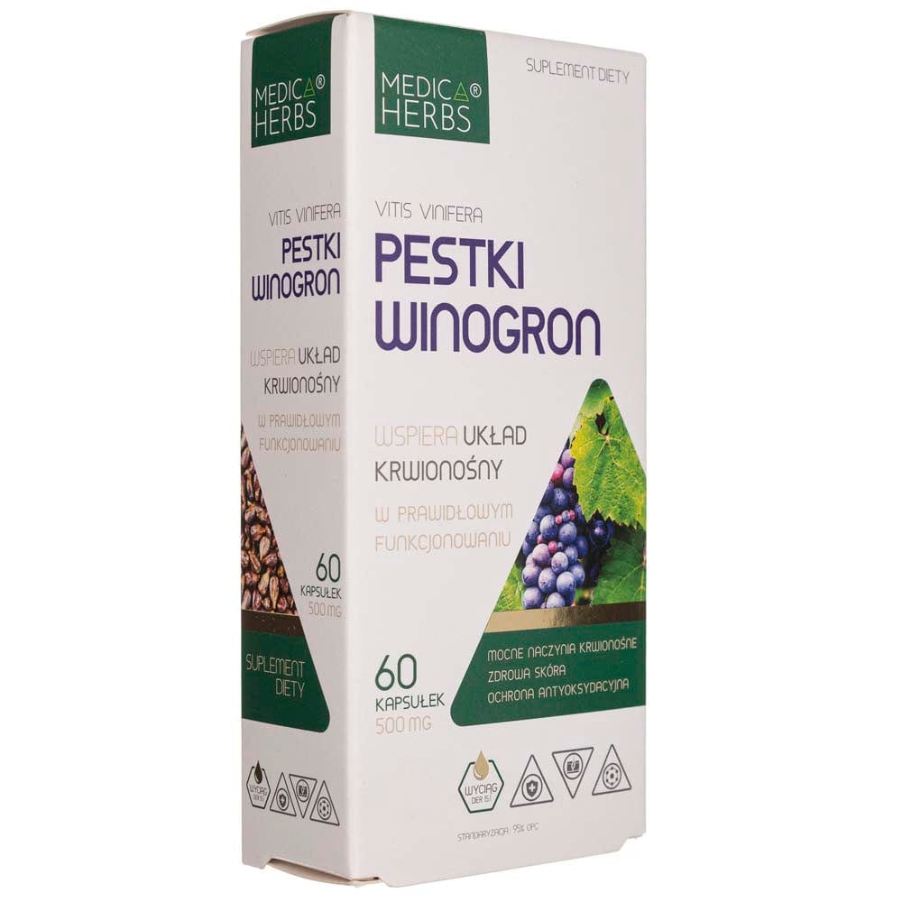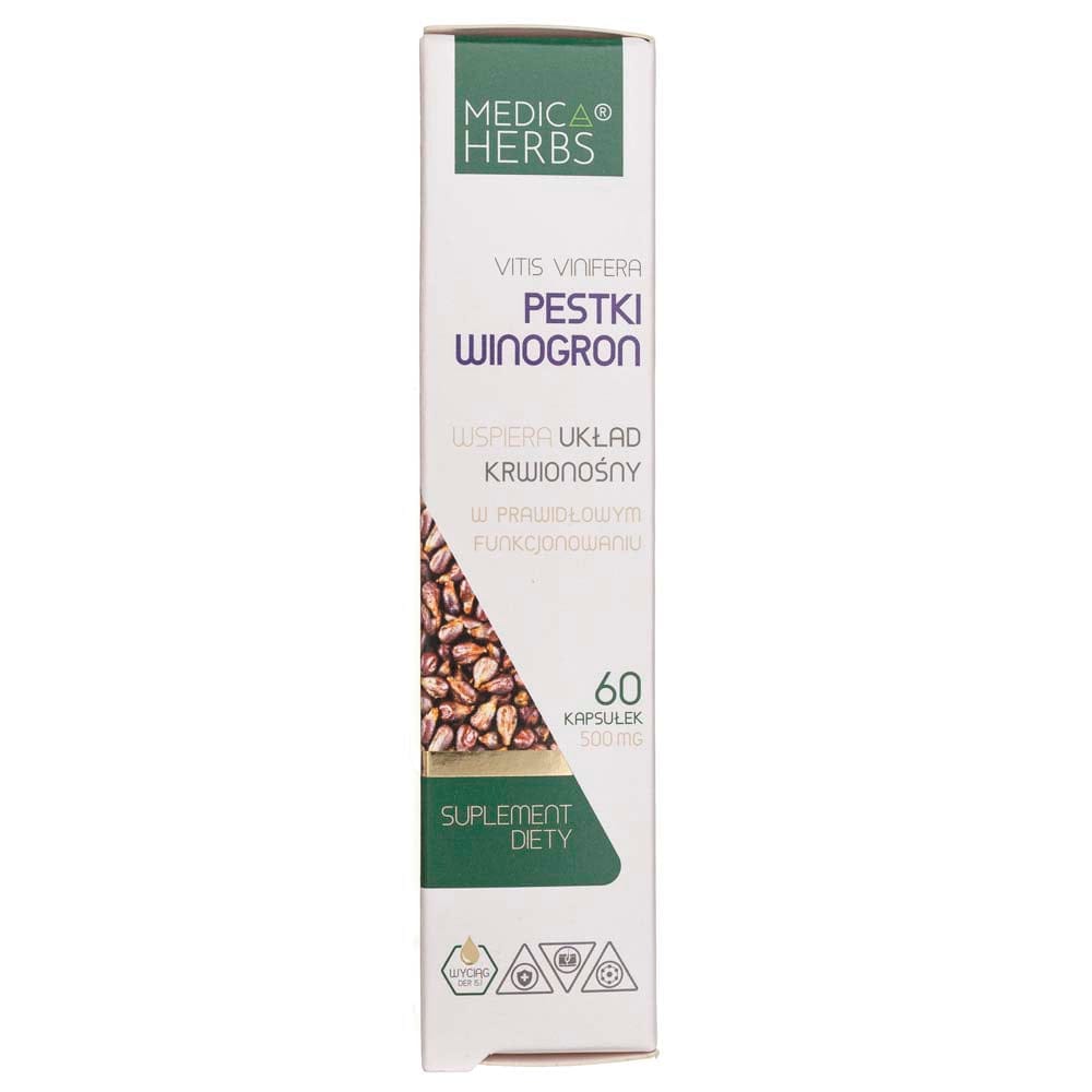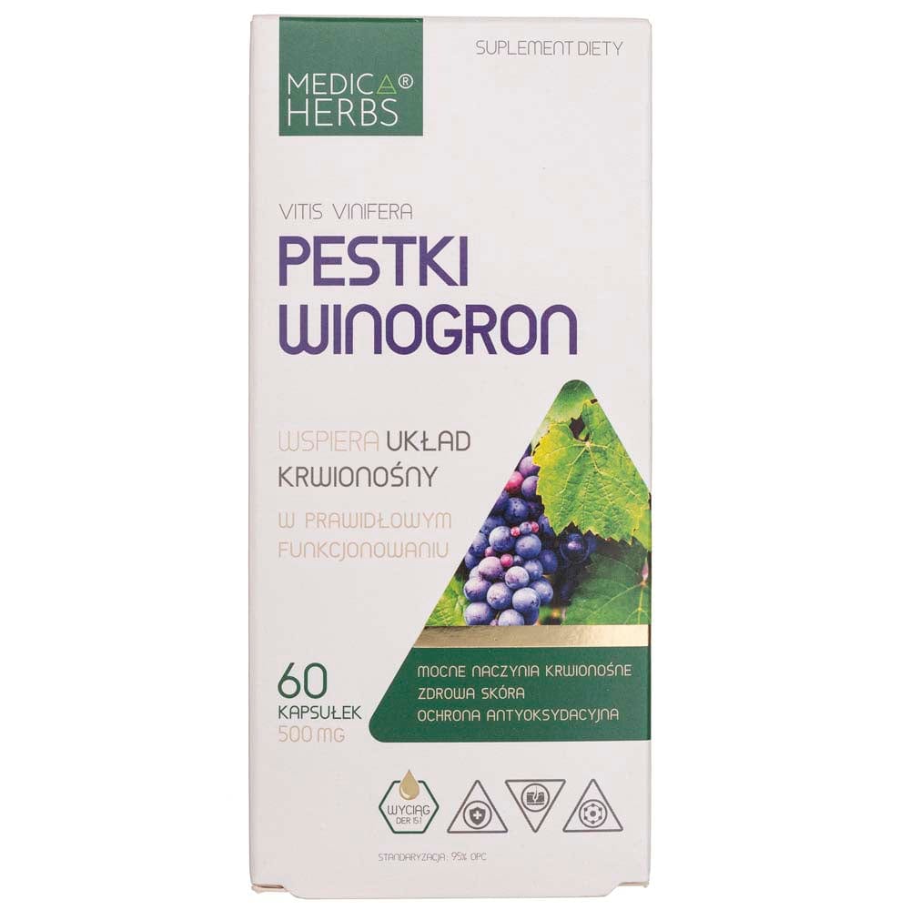 Medica Herbs Grape Seed é um suplemento alimentar em cápsulas, que contém um extrato padronizado a 95% de proantocianidinas oligoméricas (OPCs) derivadas de sementes de uva Vitis vinifera. As sementes de uva são ricas em OPCs, compostos vegetais naturais que têm sido estudados pelos seus potenciais benefícios para a saúde, incluindo propriedades antioxidantes e anti-inflamatórias, bem como a sua capacidade de apoiar a saúde cardiovascular.