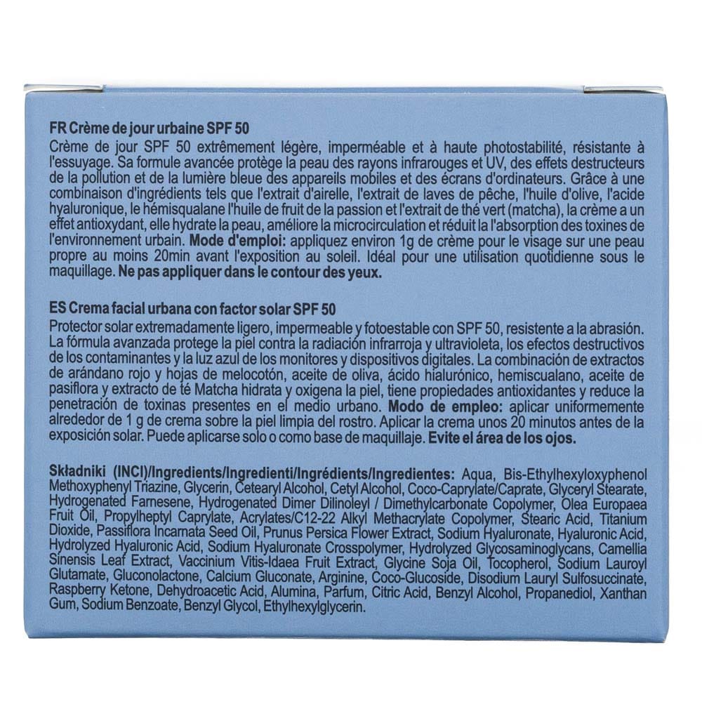 Creme excepcionalmente leve,à prova de água e fotoestável com protector solar SPF 50. A fórmula avançada protege a pele da radiação infravermelha e UV, dos efeitos destrutivos dos poluentese da luz azuldos dispositivos digitaise dos monitores.