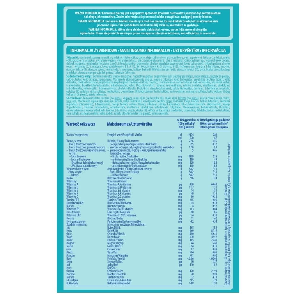 Soro de leite desmineralizado (de leite), leite desnatado, óleos vegetais (óleo de girassol, óleo de colza), lactose (do leite), citrato de cálcio, citrato de potássio, óleo de peixe, óleo de Mortierella Alpi na, cloreto de magnésio, hidróxido de potássio, emulsionante (lecitinas (de soja)), cloreto de potássio, bitartarato de colina, regulador de acidez (ácido cítrico), L-fenilalanina, fosfato de sódio, cloreto de sódio, vitaminas (C, E, niacina, ácido pantoténico, B1, A, B2, B6, ácido fólico, K, D, biotina, B12), hidróxido de cálcio, taurina, L-histidina, inositol, ferro (II) sulfato, sulfato de zinco, nucleótidos, L-carnitina, Culturas bacterianas de Bifidobacterium lactis, cobre (II) sulfato, sulfato de manganês, iodeto de potássio, proteína de soro de leite (), selenato de sódio (VI).