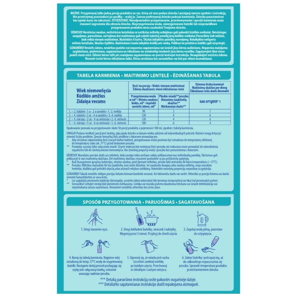 NAN OPTIpro 1 é um leite inicial especialmente formulado para as necessidades dos bebés desde o primeiro dia. Adequado como substituto do leite materno ou como complemento à amamentação. Esta fórmula inicial para bebés fornece todos os nutrientes necessários para o desenvolvimento adequado do seu filho.