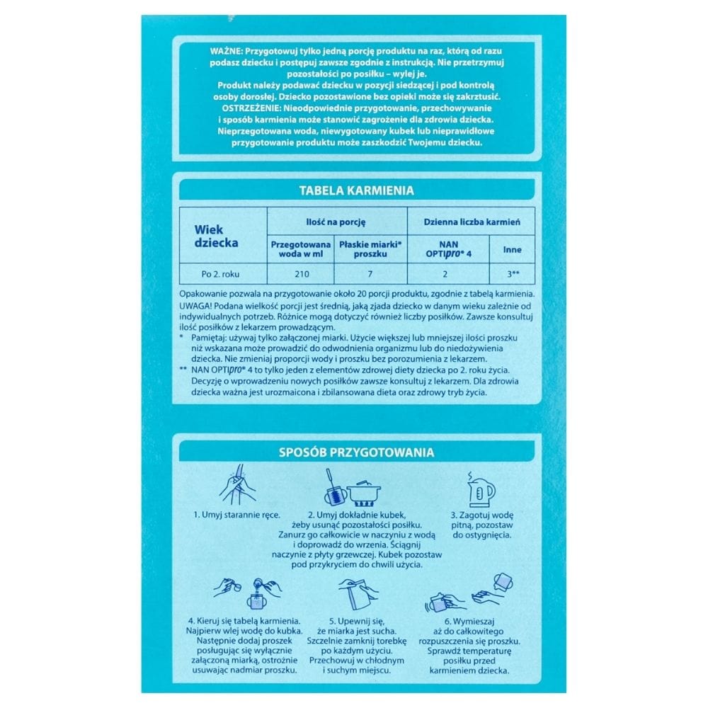 Nestlé NAN OPTIpro 4 é um produto à base de leite destinado a crianças com mais de 2 anos de idade. Enriquecido com vitaminas e minerais. Não é um substituto do leite materno, mas um produto concebido para facilitar a composição adequada da dieta de uma criança.