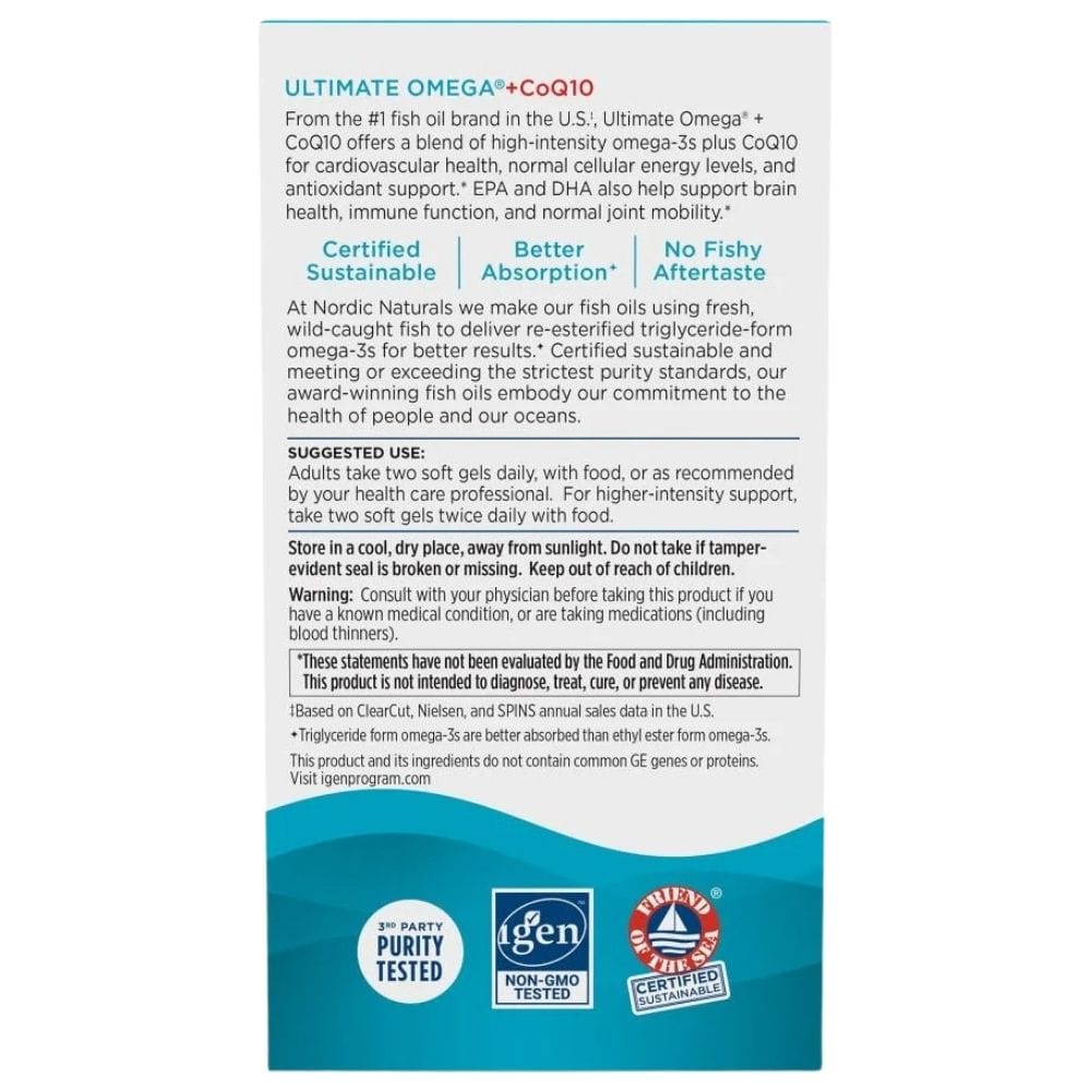 Nordic Naturals Ultimate Omega + CoQ10 é um suplemento alimentar em cápsulas de gel. Uma fonte de ácidos gordos ómega 3 com a adição de coenzima Q10.