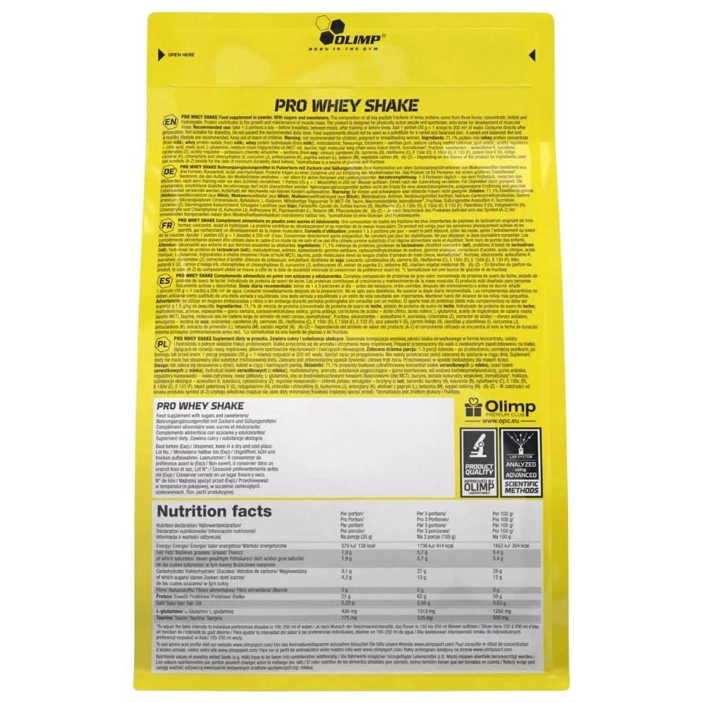 Olimp Pro Whey Shake é um suplemento alimentar em pó. Um suplemento proteico criado para pessoas com necessidades acrescidas de proteína com o objetivo de desenvolver massa muscular, principalmente atletas profissionais e praticantes de exercício físico recreativo. Combina três fontes de proteína: hidrolisado, isolado e concentrado de soro de leite.