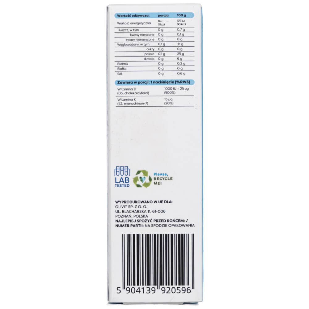 Suplemento alimentar com vitamina D3 (colecalciferol) e vitamina K2 (menaquinona-7). Spray oral com xilitol (com edulcorantes) e aroma natural de hortelã-pimenta.
