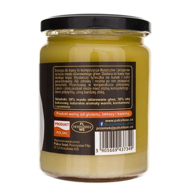 80% de manteiga ghee clarificada, óleo de coco, aromas naturais de baunilha, cardamomo e canela.