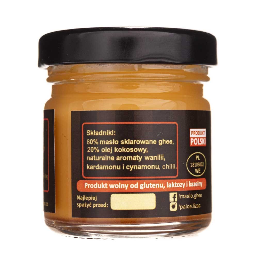 80% de manteiga ghee clarificada,20% de óleo de coco, aromas naturais de baunilha, cardamomo e canela, malagueta.
