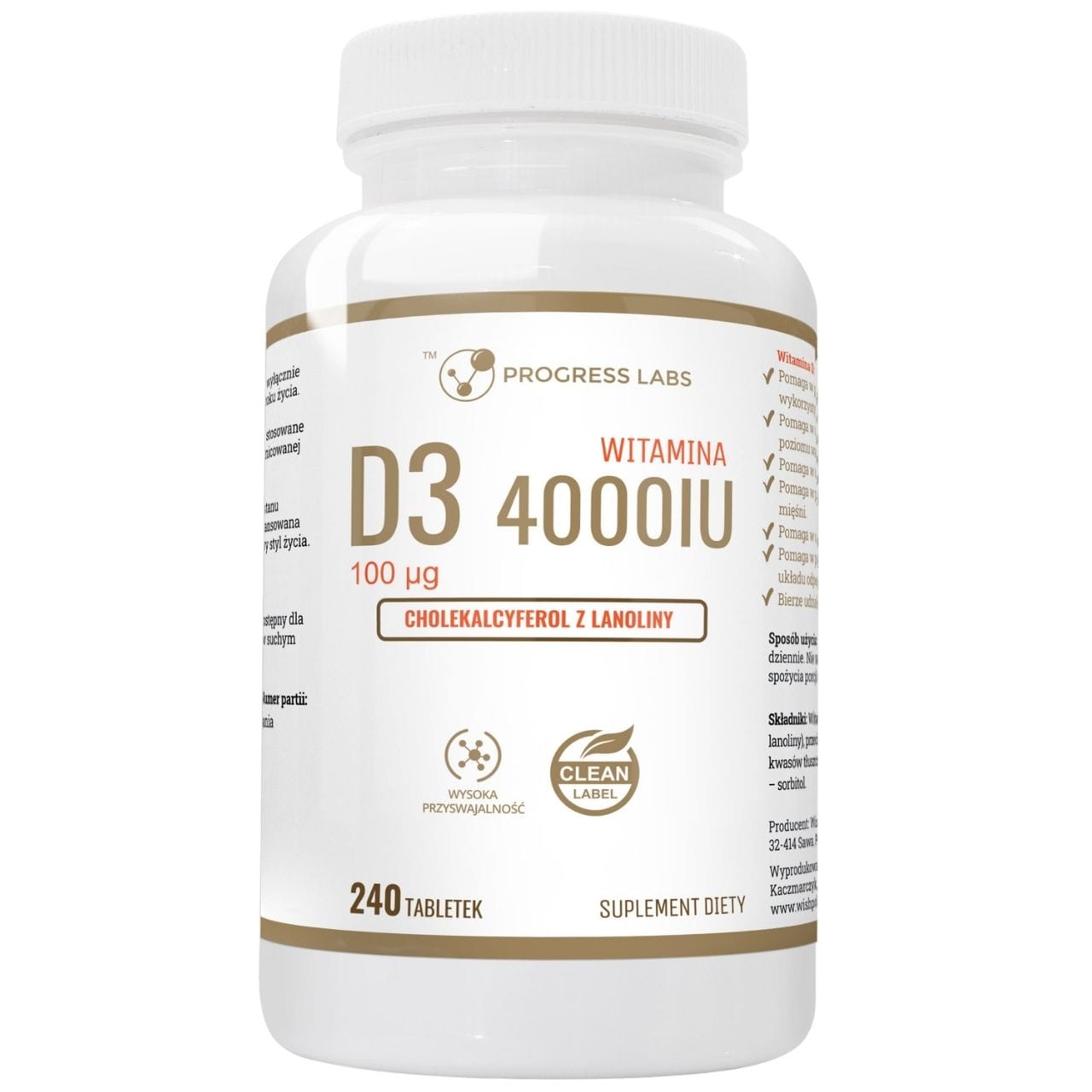 Progress Labs A vitamina D3 4000 UI é um suplemento alimentar em comprimidos que contém 100 µg ( 4000 UI , 2000% da Dose Diária Recomendada ) de colecalciferol obtido a partir da lanolina. A vitamina D contribui para a manutenção de ossos e dentes normais , absorção normal de cálcio e fósforo , níveis normais de cálcio no sangue , funcionamento normal do sistema imunitário e função muscular normal. Os comprimidos não contêm glúten, soja, lactose nem OGM. Embalagem de 240 comprimidos.