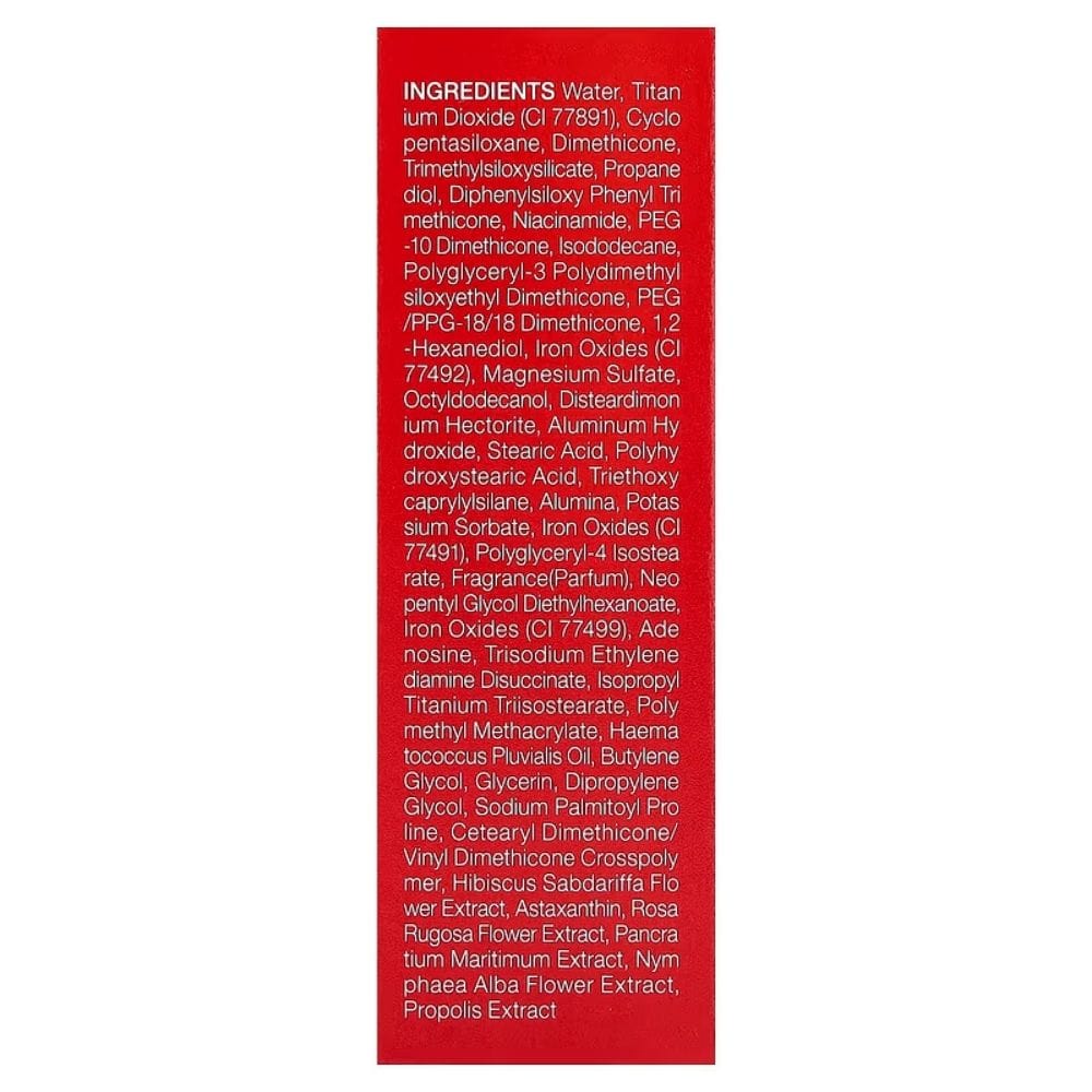 Água, dióxido de titânio (ci 77891), ciclopentasiloxano, dimeticona, trimetilsiloxissilicato, propanodiol, difenilsiloxifenil trimeticona, niacinamida, peg -10 dimeticona, isododecano, poligliceril-3 polidimetilsiloxietil dimeticona, peg /ppg-18/18 dimeticona,1,2 -hexanodiol, óxidos de ferro (ci 77492), sulfato de magnésio, octildodecanol, disteardimonium hectorite, hidróxido de alumínio, ácido esteárico, ácido polihidroxiesteárico, trietoxicaprililsilano, alumina, sorbato de potássio, óxidos de ferro (ci 77491), poligliceril-4 isostearato, fragrância (perfume), neopentilglicol dietilhexanoato, óxidos de ferro (ci 77499), adenosina, etileno trissódico diamina disuccinato, triisostearato de isopropil titânio, polimetilmetacrilato, óleo de haematococcus pluvialis, butilenoglicol, glicerina, dipropilenoglicol, palmitoil prolina de sódio, cetearil dimeticona/vinil dimeticona crosspolymer, extrato de flor de hibiscus sabdariffa, astaxantina, extrato de flor de rosa rugosa, extrato de pancratium maritimum, extrato de flor de nymphaea alba, extrato de própolis.