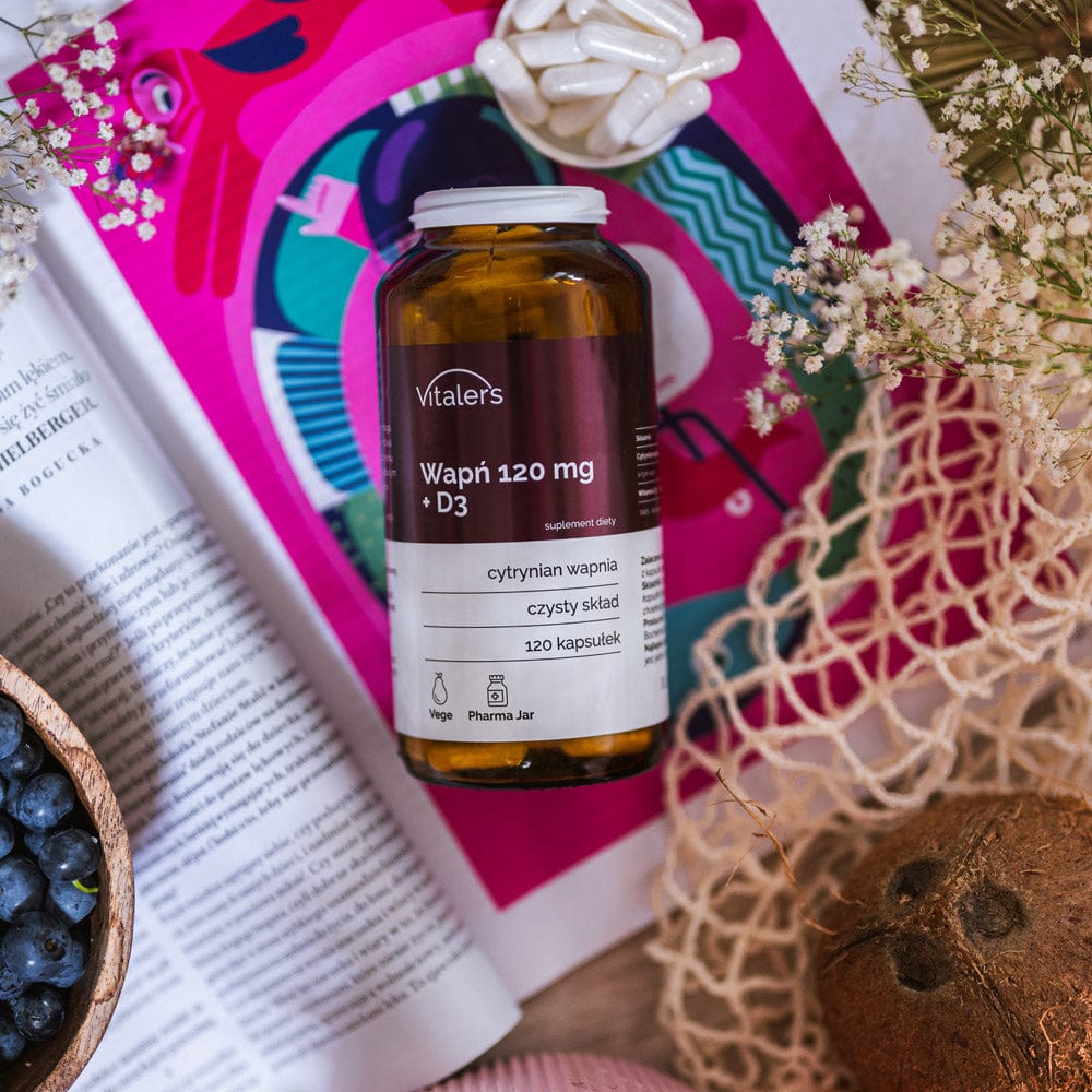 Vitaler's O suplemento alimentar Calcium 120 mg + D3 combina uma forma orgânica de cálcio e vitamina D3,, que aumentam significativamente os efeitos benéficos na estrutura óssea. O citrato de cálcio utilizado na fórmula é uma forma que não aumenta o risco de cálculos renais e é muito mais bem absorvido do que o carbonato de cálcio. O cálcio sob esta forma pode ser utilizado mesmo por pessoas que tomam medicamentos que reduzem a secreção de suco gástrico. O suplemento alimentar, graças ao seu teor de vitamina D3, é capaz de reduzir o risco de fracturas, perda de massa óssea, e, ao mesmo tempo, pode ter um efeito benéfico no bem-estar geral das mulheres pós-menopáusicas.