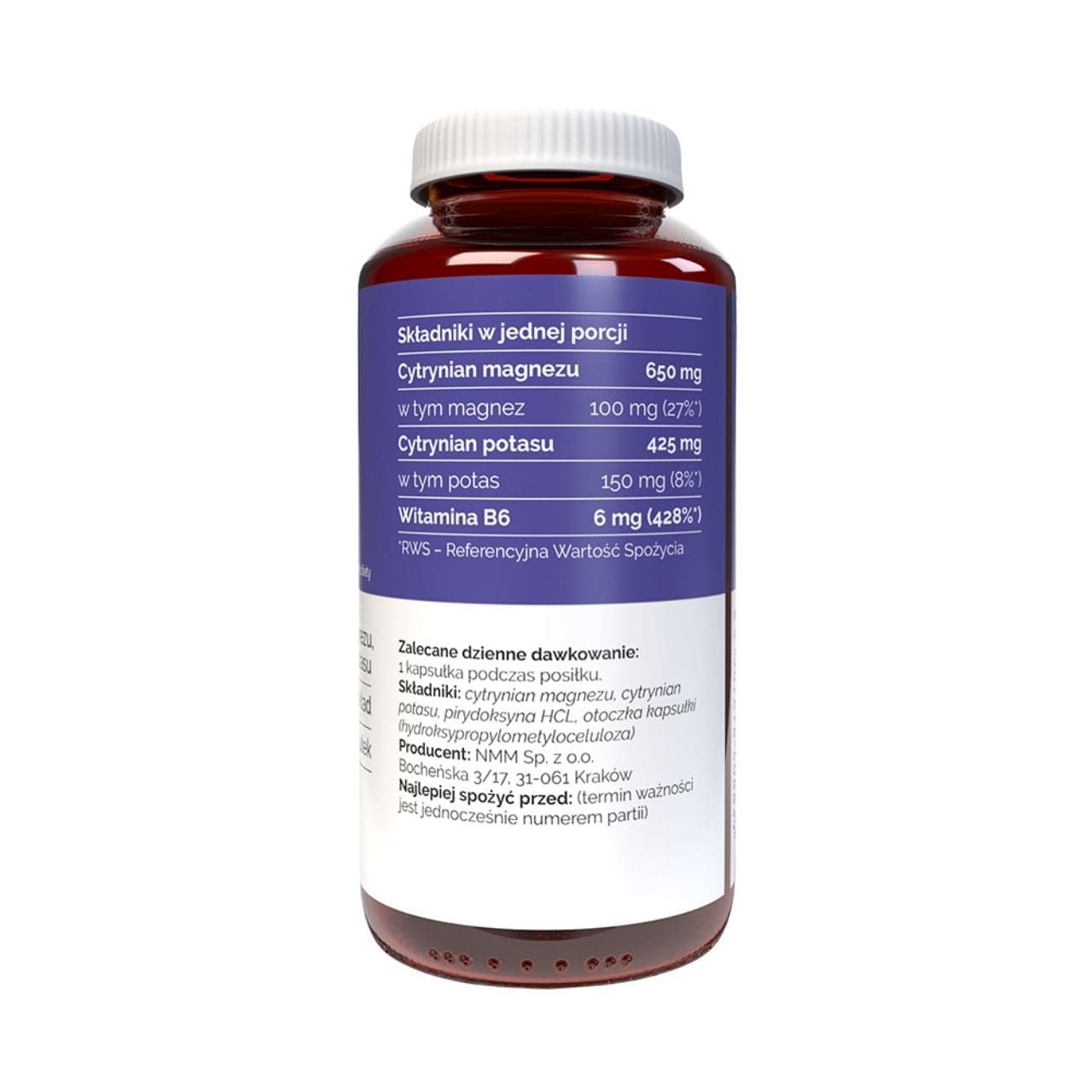 Vitaler's Magnesium + Potassium + B6 is a dietary supplement in HPMC capsules, providing in one capsule: 100 mg of magnesium (27% NRV) in the form of citrate, 150 mg of potassium in the form of citrate, and 6 mg of vitamin B6 (428% NRV). Magnesium and vitamin B6 contribute to the proper functioning of the nervous system and reduce feelings of tiredness and fatigue. Magnesium contributes to normal muscle function. Made exclusively from HPMC vegetable capsules, without unnecessary fillers. Does not contain: gluten, lactose, gelatin, soy, GMOs, sweeteners, preservatives.
