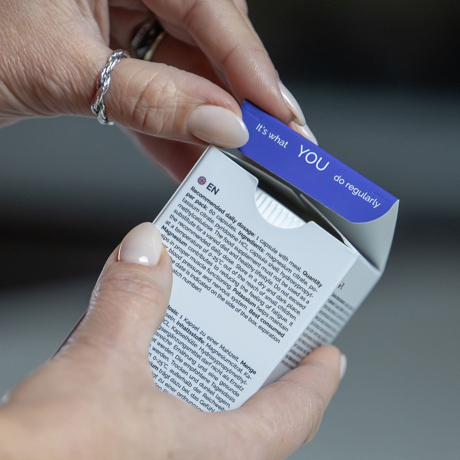 Citrato de magnésio, Citrato de potássio, Piridoxina HCL, Invólucro da cápsula: hidroxipropilmetilcelulose.