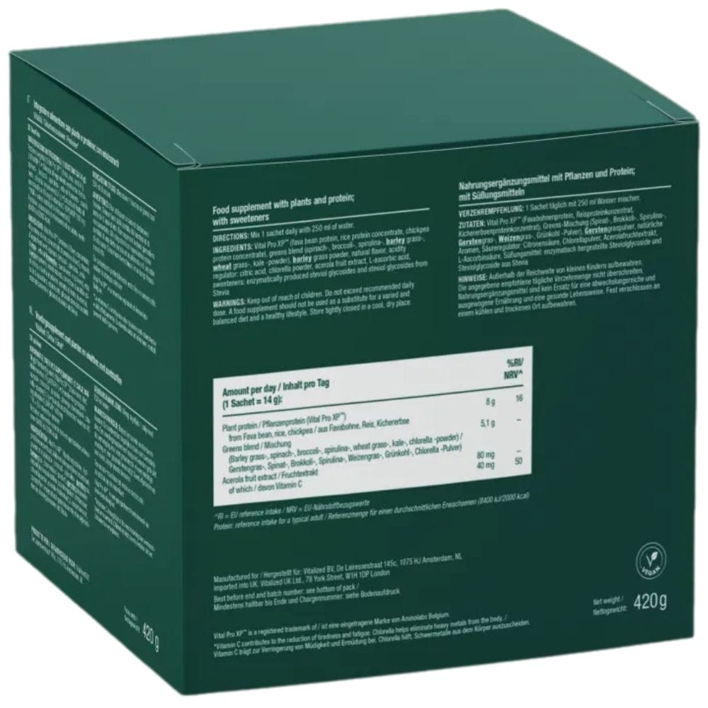 Vital Pro XP™ (favas, concentrado proteico de arroz, concentrado proteico de grão-de-bico), mistura de vegetais (espinafres em pó, brócolos em pó, espirulina em pó, erva de cevada em pó, couve em pó), erva de cevada em pó, aroma natural, regulador de acidez: ácido cítrico, clorela em pó, extrato de frutos de acerola, ácido L-ascórbico, edulcorantes: glicosídeos de esteviol produzidos enzimaticamente e glicosídeos de esteviol provenientes da estévia.