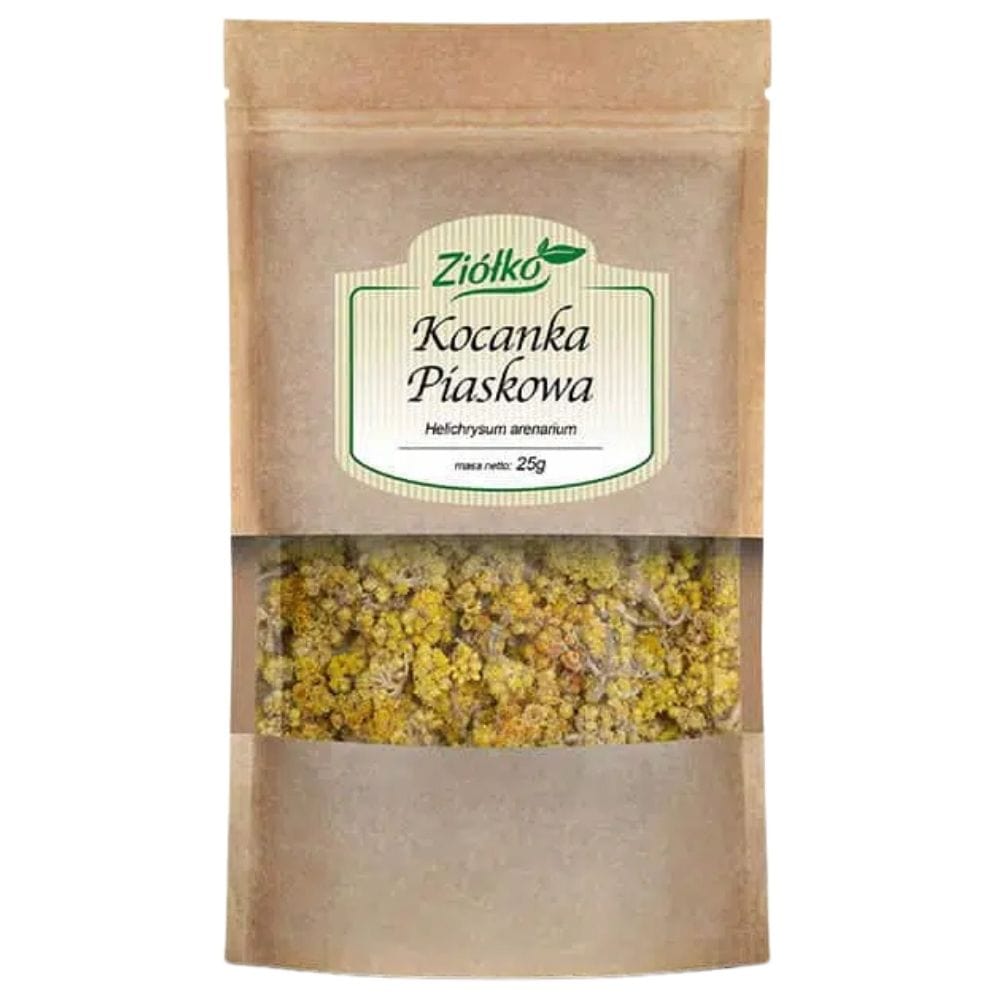 Imortela (Helichrysum arenarium) é uma planta herbácea perene que ocorre naturalmente na Europa, incluindo a Polónia, especialmente em solos arenosos e secos. As suas pequenas inflorescências amarelo-douradas são colhidas durante a floração plena, geralmente no verão, quando contêm as substâncias mais ativas. As flores secas de helichrysum são utilizadas na medicina tradicional à base de ervas há séculos devido aos seus benefícios para a saúde do fígado e do sistema digestivo. O aroma característico, delicadamente picante e o sabor amargo da infusão devem-se aos óleos essenciais e compostos amargos contidos na planta, que estimulam a secreção dos sucos digestivos.
